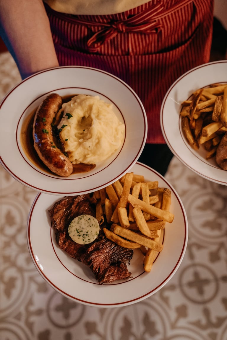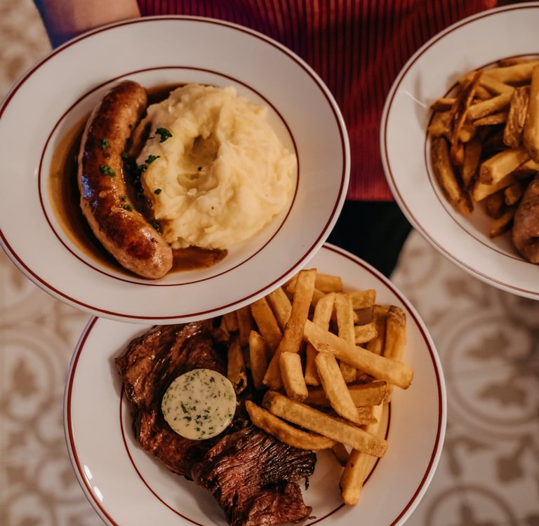 Saucisse de Toulouse, purée, jus de viande - 11.90 Steak, frites, beurre maître d'hôtel - 14.50